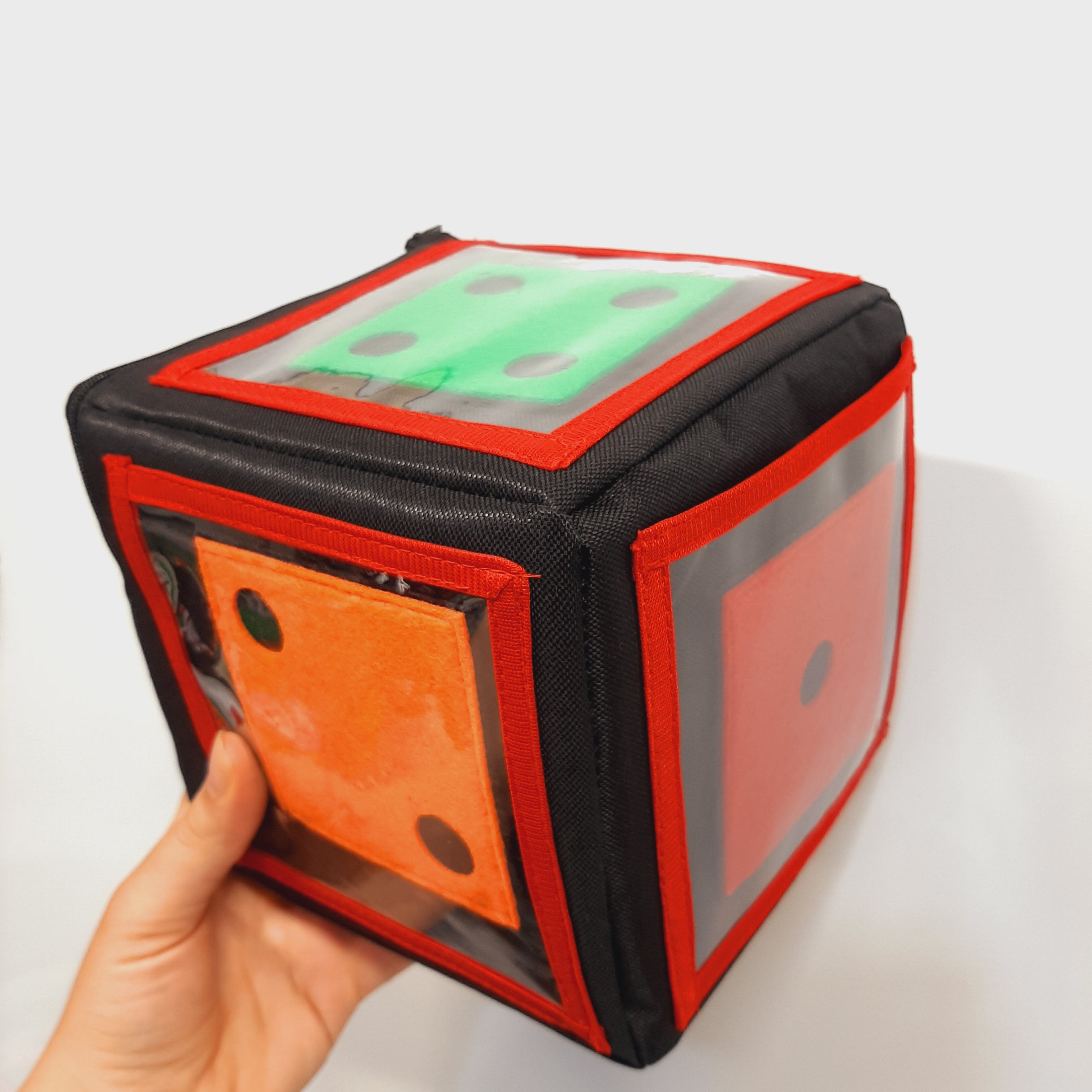 این تاس به گونه ای طراحی شده که شما می تونید با طراحی کارت های مختلف برای هر مبحث و قراردادن اون ها در جیب های تاس، بازی های متفاوتی رو با بچه ها انجام بدید .